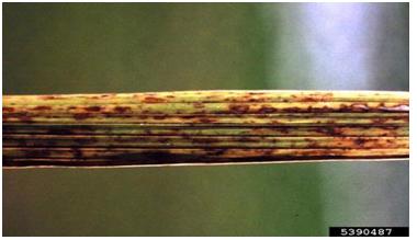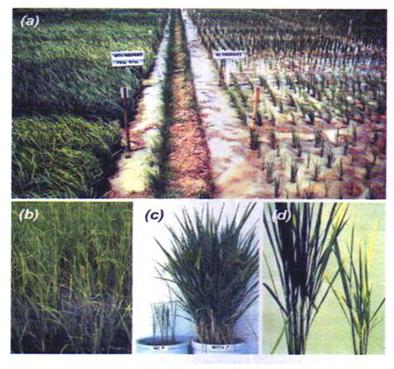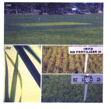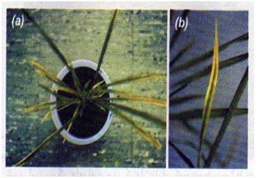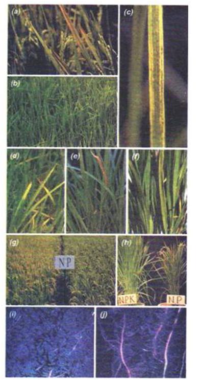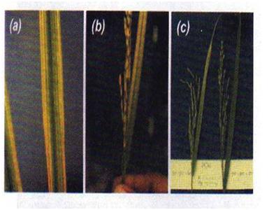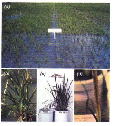 سيليسيم صفت مشخصه كمبود سيليسيم، لكههاي قهوهاي روي برگها ميباشد (الف) كمبود سيليسيم اغلب منجر به كاهش مقاومت به بيماريهايي از قبيل bipolaris oryzae ميشود |
