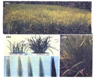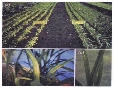 گوگرد (الف) تاج پوشه از دور زرد به نظر ميرسد كه اين به علت زرد شدن برگهاي جوان ميباشد و ارتفاع گياه و پنجهزني كاهش مييابد |