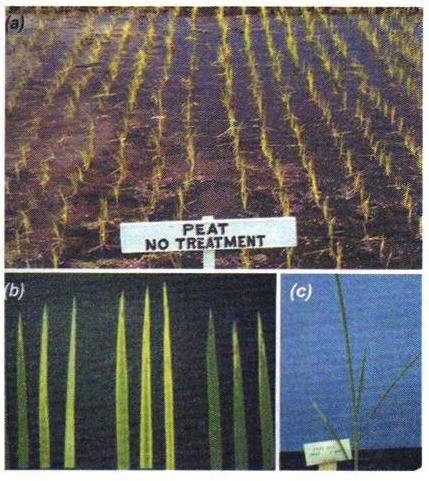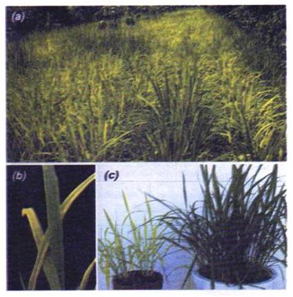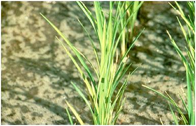 بر كمبود برموجب زردشدن لكهاي برگ وزردشدن نقطهاي نوكهاي برگ ميشود. كمبود اين عنصر ميتواند باعث تغييرشكل برگ گياه شده و موجب كاهش توليد دانه برنج نيز ميشود |
